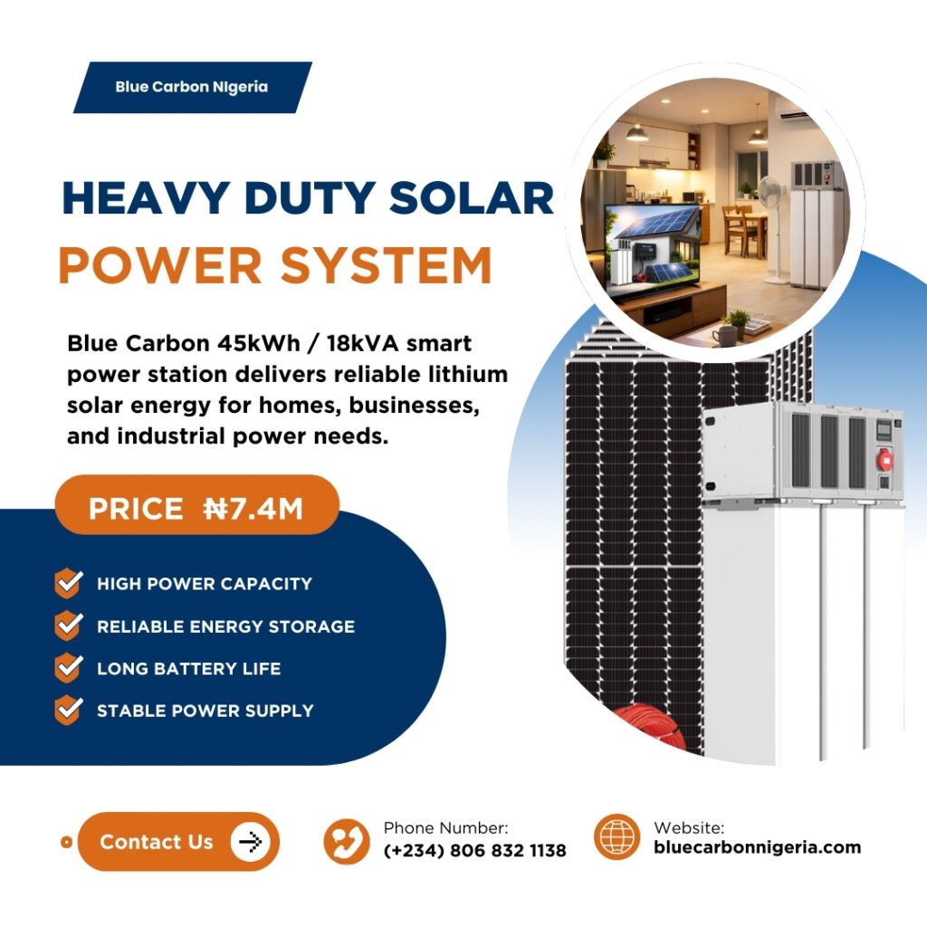 Power your home or business with the Blue Carbon 45kWh / 18kVA Smart Power Station — a high-capacity solar energy system built for reliable, uninterrupted electricity. Designed with advanced lithium battery technology, it delivers stable power, reduces fuel costs, and keeps your operations running day and night.